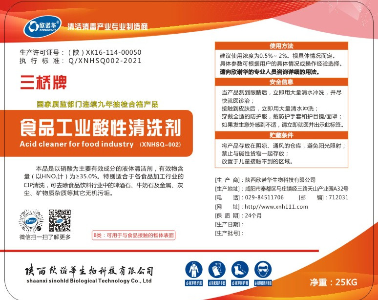 三橋牌食品工業(yè)酸性清洗劑(XNHSQ-2型)是以硝酸為主要有效成分的液體清潔劑,有效成份為35%,特別適合用于食品、飲料、乳品、啤酒等行業(yè)設(shè)備,容器、管道的CIP清洗使用。