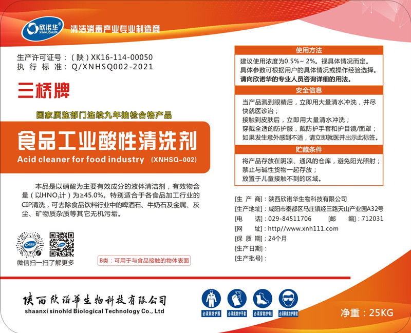 陜西欣諾華生物科技有限公司是生產食品級硝酸(三橋牌食品工業(yè)酸性清洗劑)的專業(yè)廠家,生產許可證號:陜XK16-114-00050有效成份為35~60%,特別適合用于食品、飲料、乳品、啤酒等行業(yè)設備,容器、管道的CIP清洗使用。