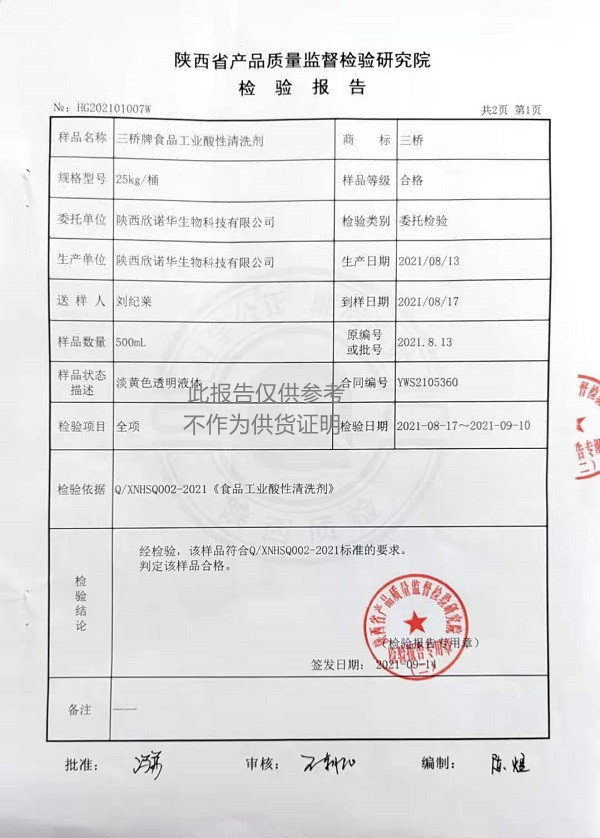 食品級(jí)酸性清洗劑檢測(cè)報(bào)告三橋牌食品工業(yè)酸性清洗劑(XNHSQ-2型)檢測(cè)報(bào)告(2021年度)