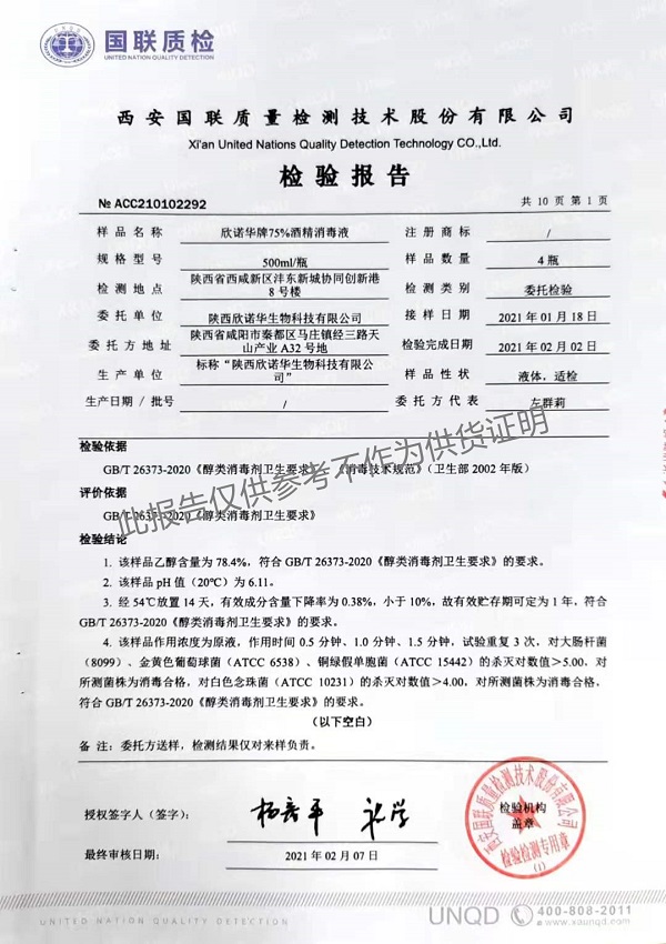欣諾華牌75%酒精消毒液 檢測(cè)報(bào)告(2021年度)-陜西欣諾華生物科技有限公司