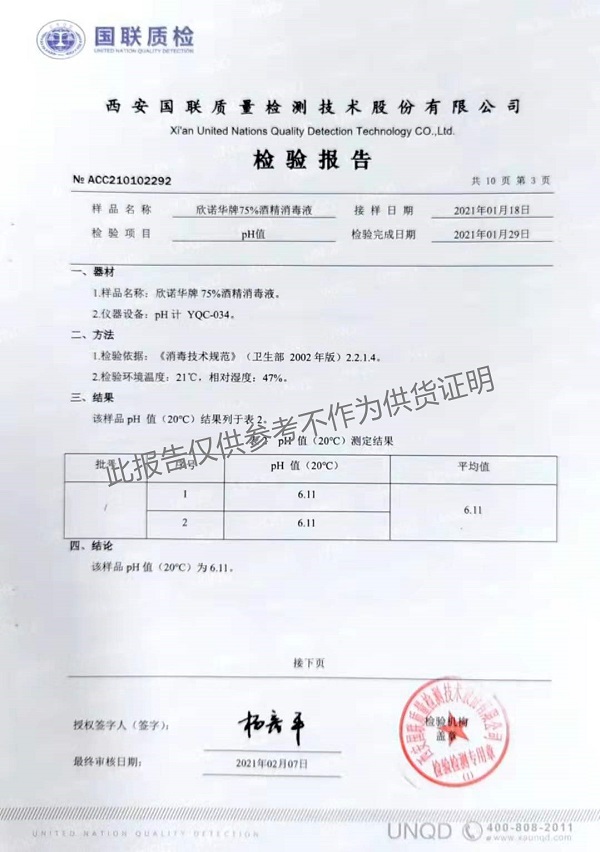 欣諾華牌75%酒精消毒液 檢測(cè)報(bào)告