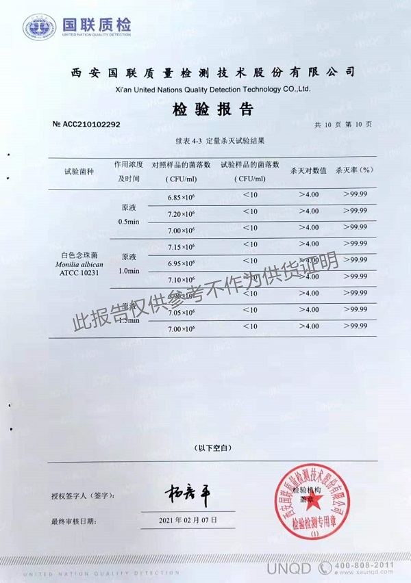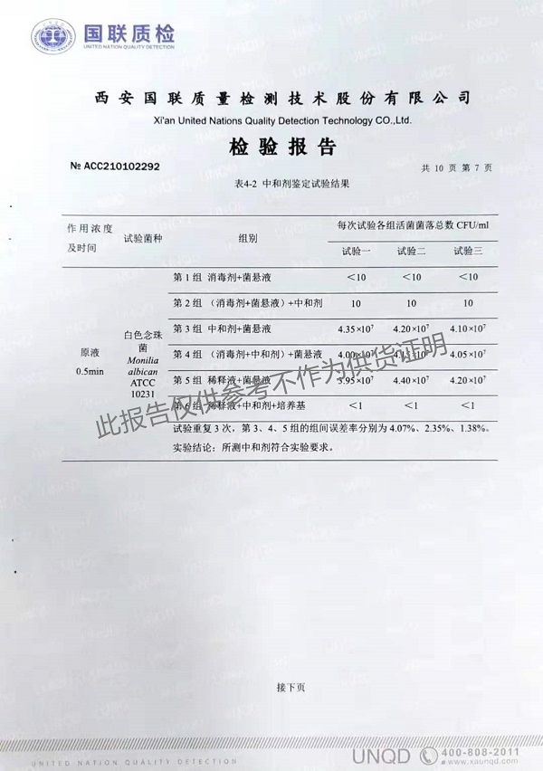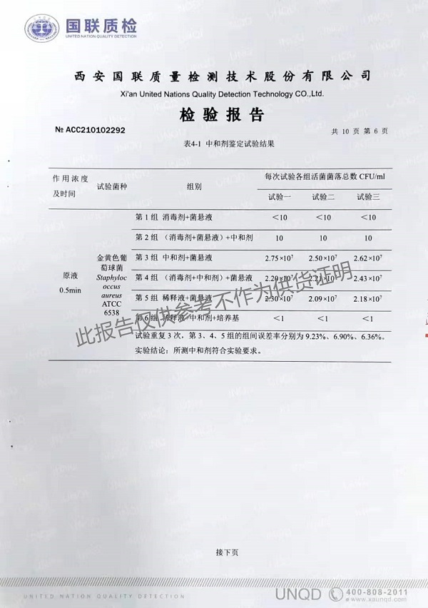 欣諾華牌復(fù)合季銨鹽消毒液(XNH100型)檢測(cè)報(bào)告