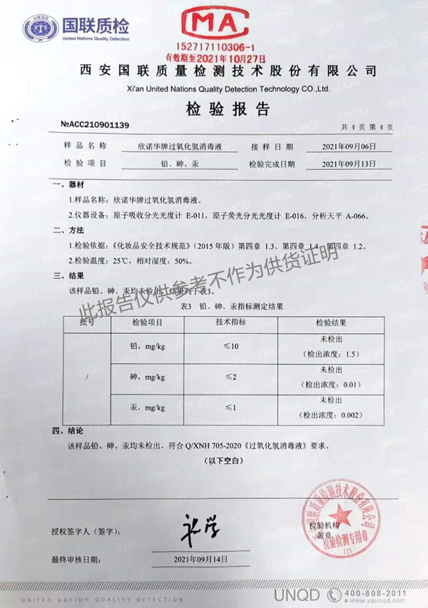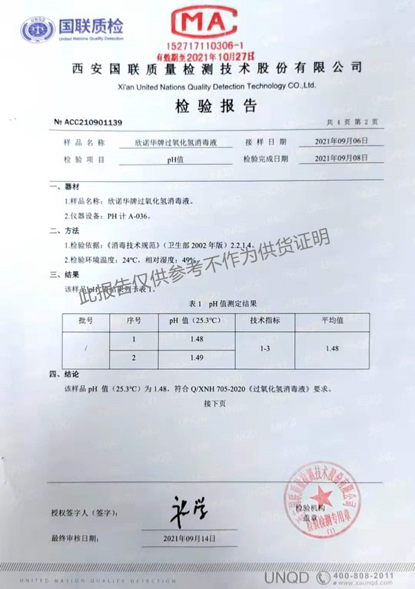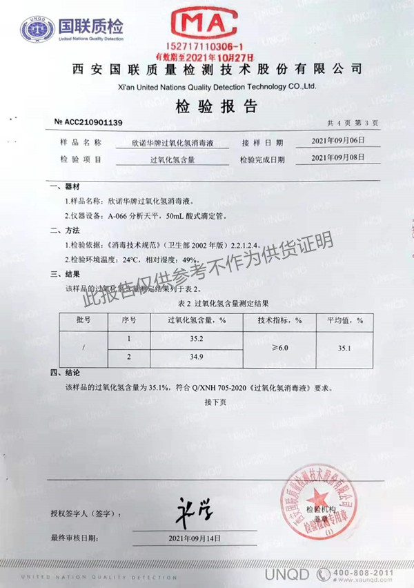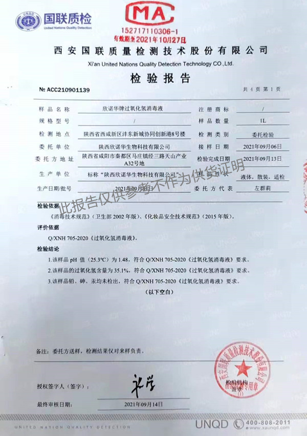 欣諾華牌過氧化氫消毒液(XNH705型)檢測報告(2021年度)-陜西欣諾華生物科技有限公司