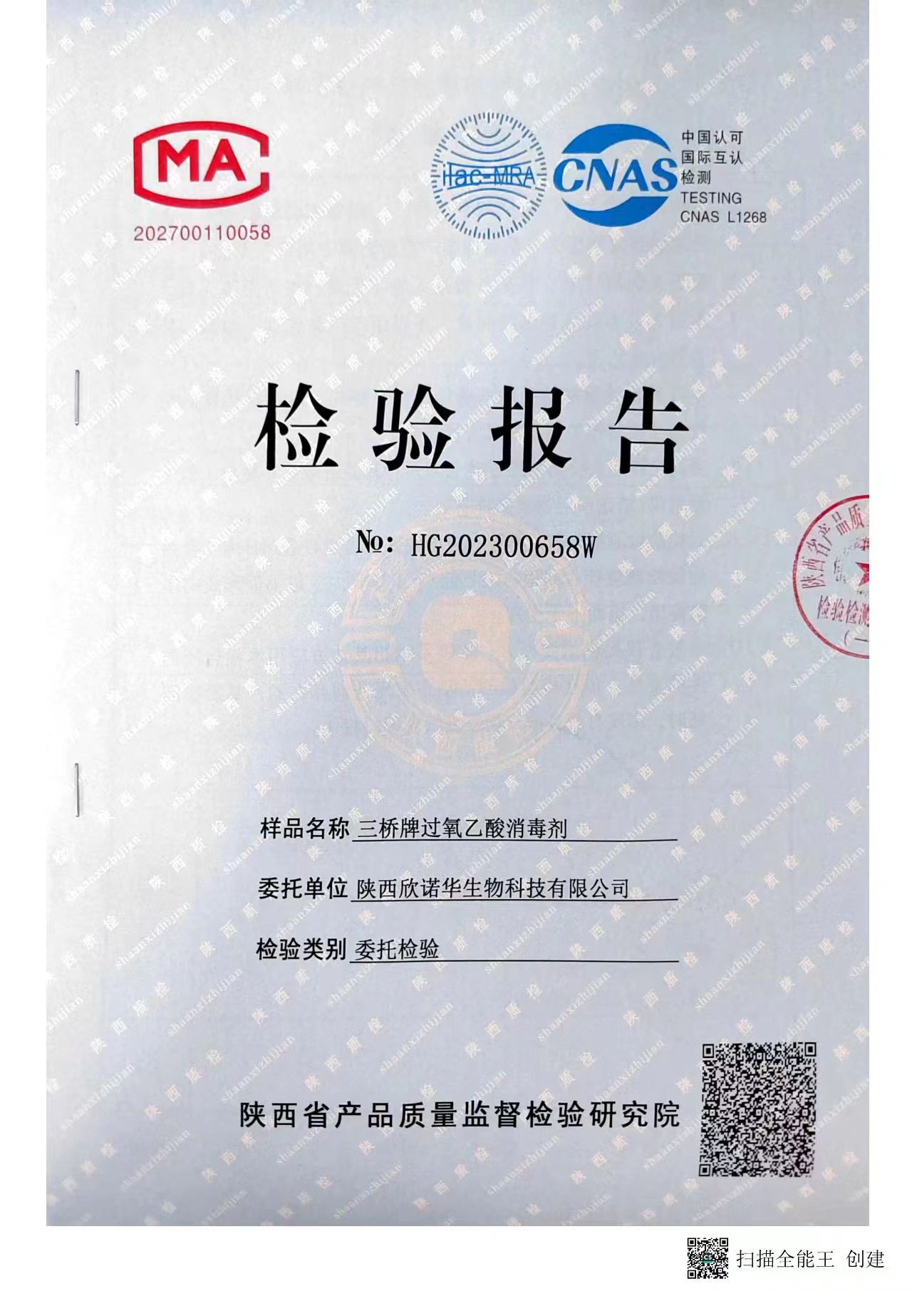 三橋牌過(guò)氧乙酸消毒液第三方檢測(cè)報(bào)告(2023年度)-陜西欣諾華生物科技有限公司
